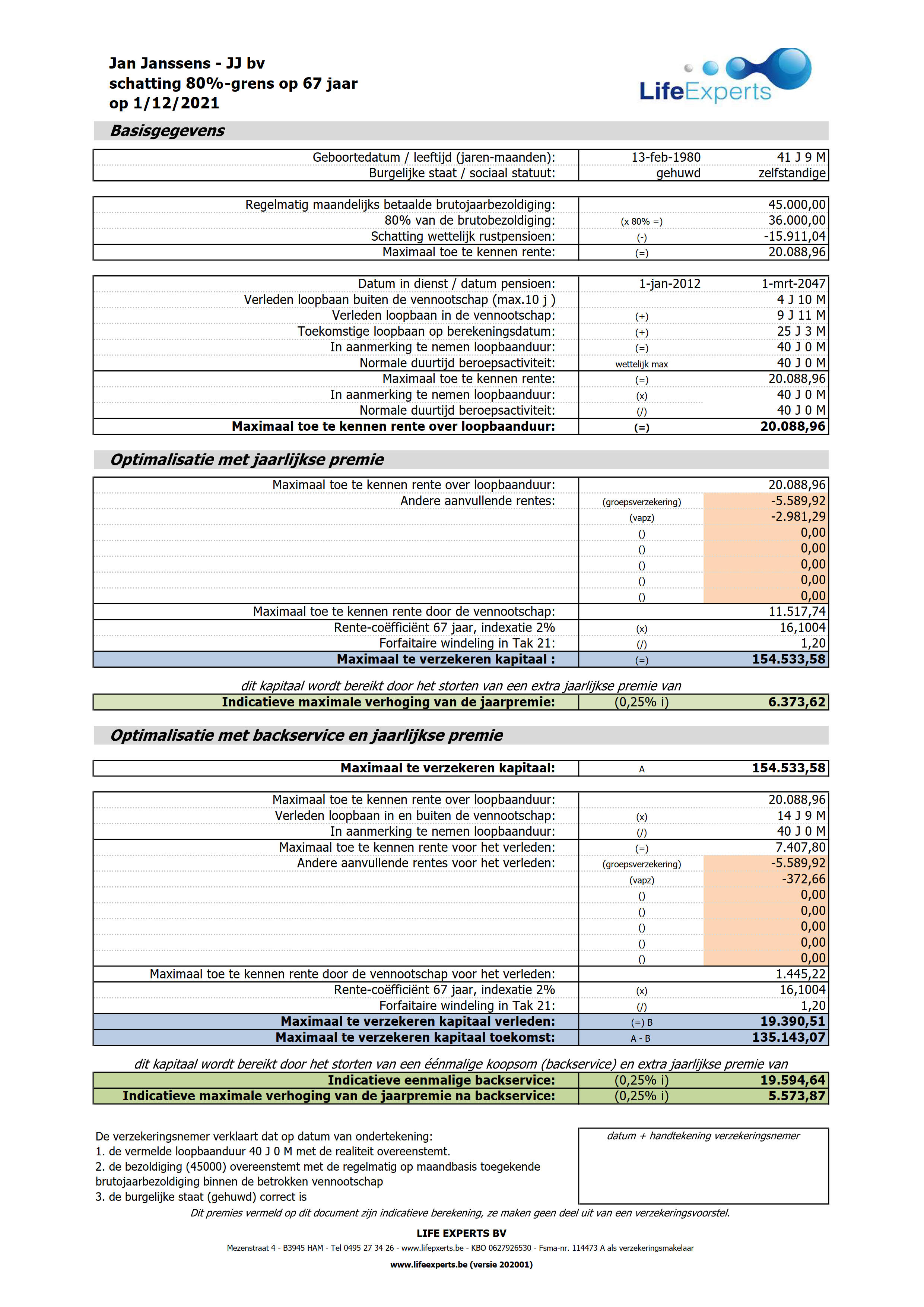 Life Experts gebruikt in sommige gevallen een intern rekenmodel zodat we kunnen de berekeningen van de verzekeraars afchecken of zodat we kunnen snel advies geven aan de klant en zijn accountant. In bijlage vindt u zo'n indicatief voorbeeld van dit rekenmodel.